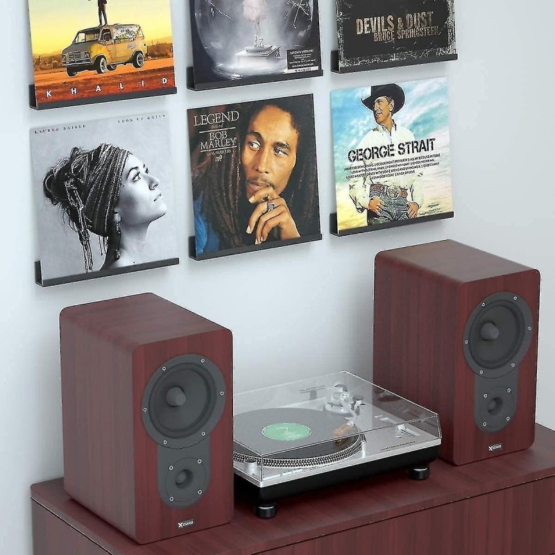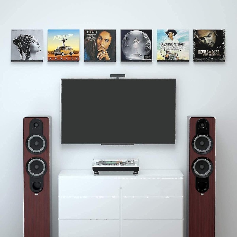 Set van 6 transparante vinylplatenhouders, afmetingen 30,5 x 4,3 x 5 cm, inclusief 12 bevestigingsschroeven. Deze houders zijn transparant, waardoor de albumhoes goed zichtbaar is na installatie. Ze zijn een onmisbaar accessoire voor muziekliefhebbers die op zoek zijn naar een stijlvol displaysysteem voor hun grote vinylcollectie.