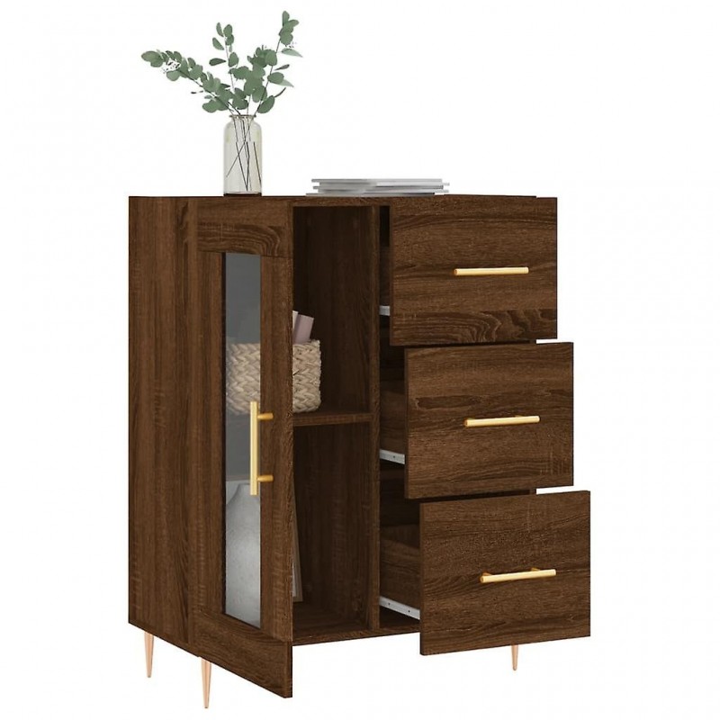 Met zijn tijdloze design is dit klassieke dressoir de perfecte aanvulling op uw huis. Duurzaam materiaal: Hout is een hoogwaardig materiaal met een glad, duurzaam, stabiel en vochtbestendig oppervlak. Ruime opbergruimte: Met drie lades, twee compartimenten achter het dressoir en een glazen deur biedt het dressoir voldoende opbergruimte. Ruimte om diverse dagelijkse spullen georganiseerd en binnen handbereik te houden. Uiterlijk: Het stevige bovenblad is ideaal voor het tentoonstellen van decoratieve objecten, schilderijen en potplanten. Praktische deur: Dit meubelstuk houdt uw belangrijkste spullen netjes en georganiseerd en beschermt ze tegen stof. Metalen poten: De metalen poten geven een elegante uitstraling en zorgen voor veiligheid en stabiliteit. Waarschuwing: Om te voorkomen dat het product omvalt, moet het worden vastgezet met de meegeleverde muurbeugel. Kleur: Bruin eikeneffect Materiaal: Hout, Metaal, Glas Afmetingen: 69,5 x 34 x 90 cm (B x D x H) Montage vereist: Ja Juridische documenten: